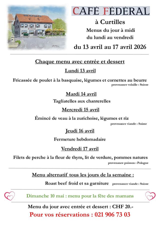 Situé sur le chemin de Compostelle à Curtilles, le restaurant Café Fédéral est un établissement où il fait bon se retrouver pour partager un repas dans une atmosphère conviviale.
